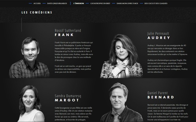 Sur le web, les thèmes de l'amour, du sexe, de l'angoisse, du couple, de l'amitié, de la grossesse et du travail sont abordés à travers une série de contenus variés : des questions audacieuses posées à des couples dans les vidéos Dans mon livre à moi, des citations et gifs croustillants tirées de l'émission dans Catastrophe en bref, des questions quiz indiscrètes dans Des clics et des claques, sans oublier le grand concours Une date (in)oubliable, maintenant terminé, où les internautes pouvaient partager leurs histoires de rencontres amoureuses hors de l'ordinaire et remporter un voyage à Philadelphie !