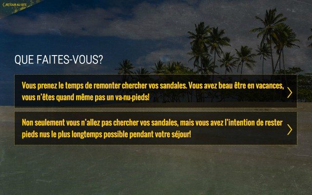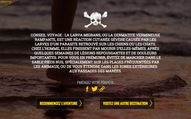 À travers huit destinations différentes, les utilisateurs étaient invités à partir à l'aventure en choisissant leur propre itinéraire. Chacune de leurs décisions influençait ainsi la suite du parcours et, s'ils ne faisaient pas le bon choix, le voyage pouvait rapidement tourner au cauchemar !