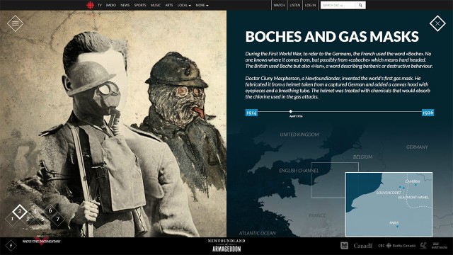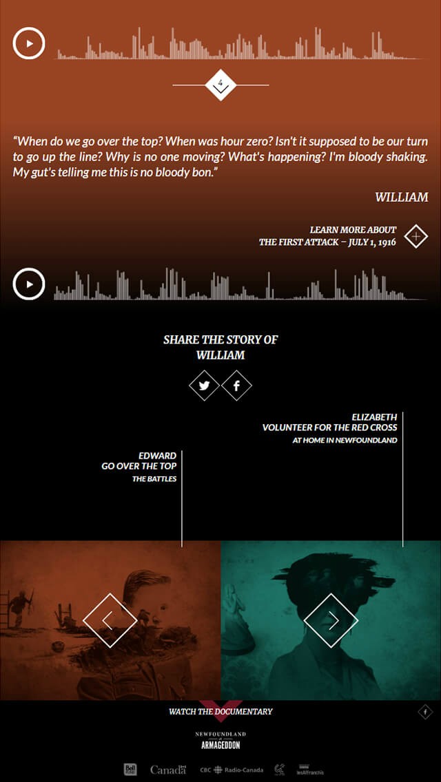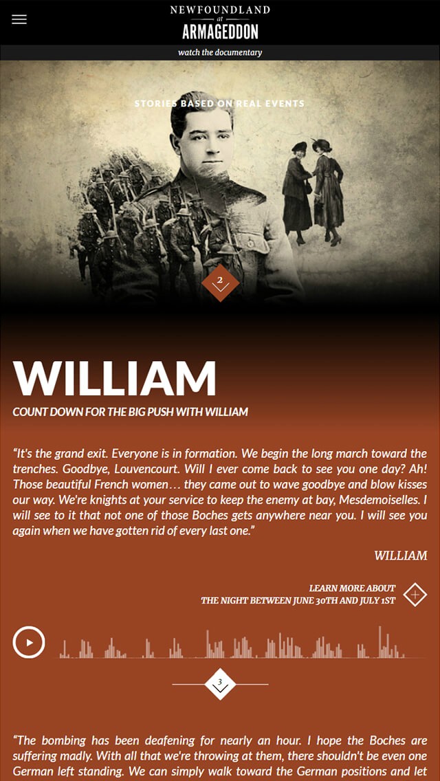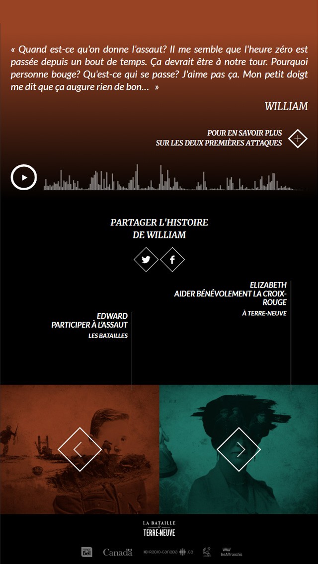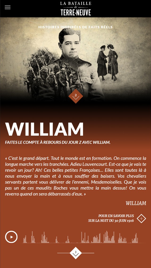 Ce projet interactif et novateur a été réalisé en parallèle du film documentaire du même nom, diffusé en anglais sur les ondes de CBC et en français sur ICI Radio-Canada. On y découvre une série d'histoires, inspirées de faits réels, vécues par des hommes et des femmes de Terre-Neuve, plongés au coeur de la Grande Guerre.