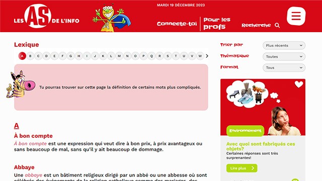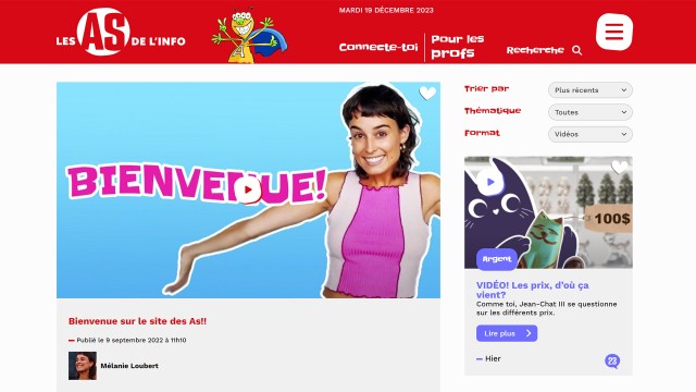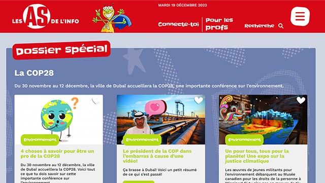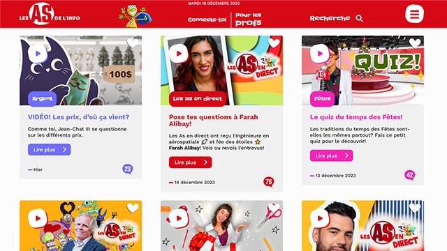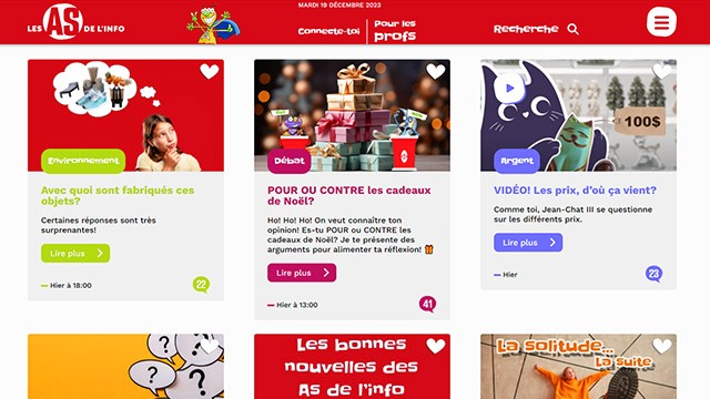 Les as de l'info est une plateforme qui présente l'actualité quotidienne aux enfants âgés entre 8 et 12 ans. Les contenus y sont rédigés par des journalistes et des spécialistes de la vulgarisation pour les jeunes.