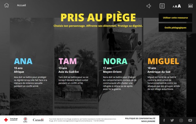 Conçu pour les enseignants et les élèves de 13 à 18 ans, à la manière d'un jeu « dont vous êtes le héros », Pris au piège vise à amener les élèves à mieux comprendre le droit international humanitaire et les enjeux humanitaires. L'expérience permet aux utilisateurs de se mettre virtuellement à la place de quatre jeunes adolescents, évoluant dans un contexte de conflit armé.