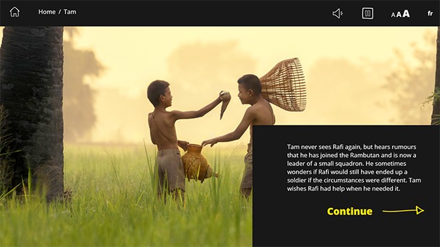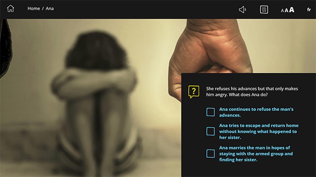 Qu'il s'agisse d'aider Ana qui fait face à la menace de violence sexuelle en Afrique, Tam qui devient enfant-soldat en Asie du Sud-Est, Nora qui doit changer les comportements sociaux de sa communauté au Moyen-Orient ou encore Miguel qui tente de sauver son territoire des mains des rebelles, l'utilisateur doit faire des choix, parfois difficiles, qui orienteront le cours de l'histoire des protagonistes.