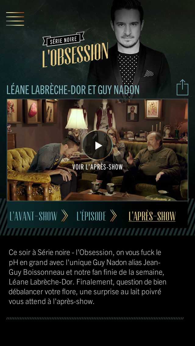 Dans cette optique, pour accompagner la nouvelle saison et offrir l'ultime expérience aux fans de la série, nous avons élaboré un après-show hebdomadaire disponible sur le web immédiatement après la diffusion télé. Animé par Sébastien Diaz, Série noire – l'Obsession décortiquait l'épisode de la semaine en compagnie d'une distribution d'invités éclectiques favorisant le rayonnement de la série à l'extérieur de la sphère de fans déjà établie. Aussi, afin de pousser encore plus loin la diffusion de contenus, un module interactif diffusant des microcontenus en simultané a été intégré au lecteur de l'après-show.